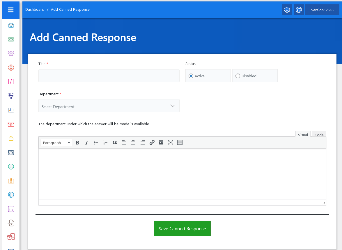 Adding a new canned response is simple. Just click the “Add Canned Response” button. You’ll be prompted to enter the Title, Department, Detailed Content (via a rich-text editor), and Status. This allows you to manage canned responses in a structured way.
