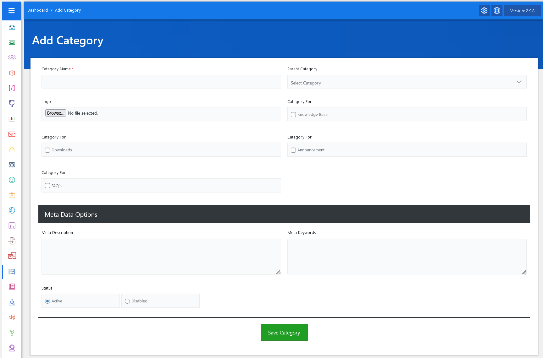 - Status: Here, you can choose whether the category should be Active or Disabled.