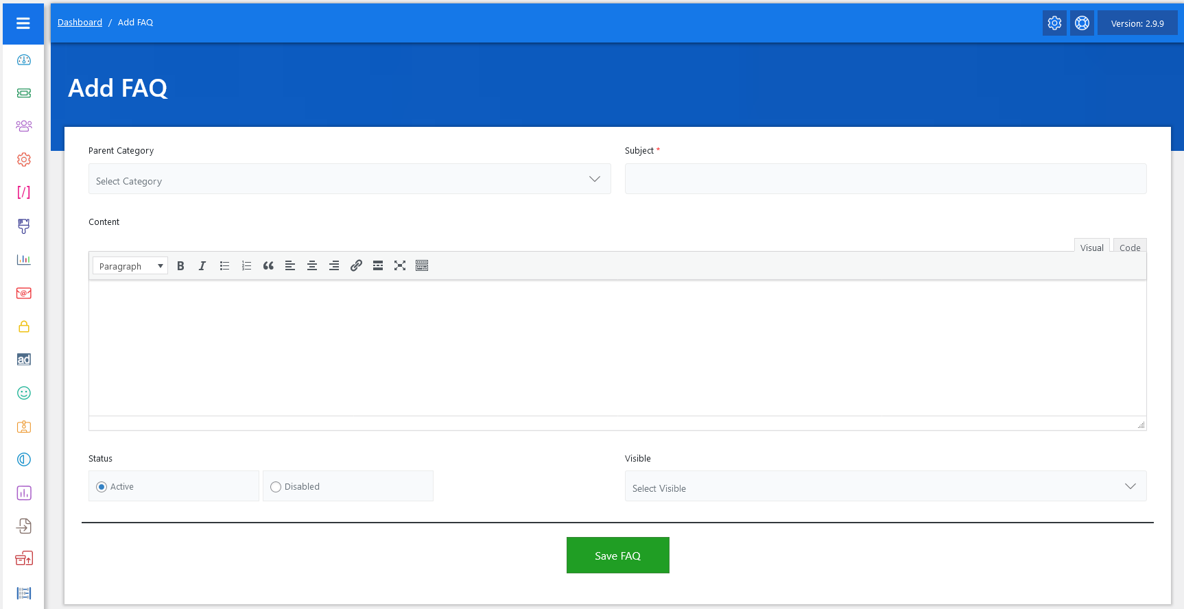 Adding a new faq is simple. Just click the “Add FAQ” button. You’ll be prompted to enter the Category, Subject, Detailed Content (via a rich-text editor), Status, and Visible. This allows you to manage content in a structured way.