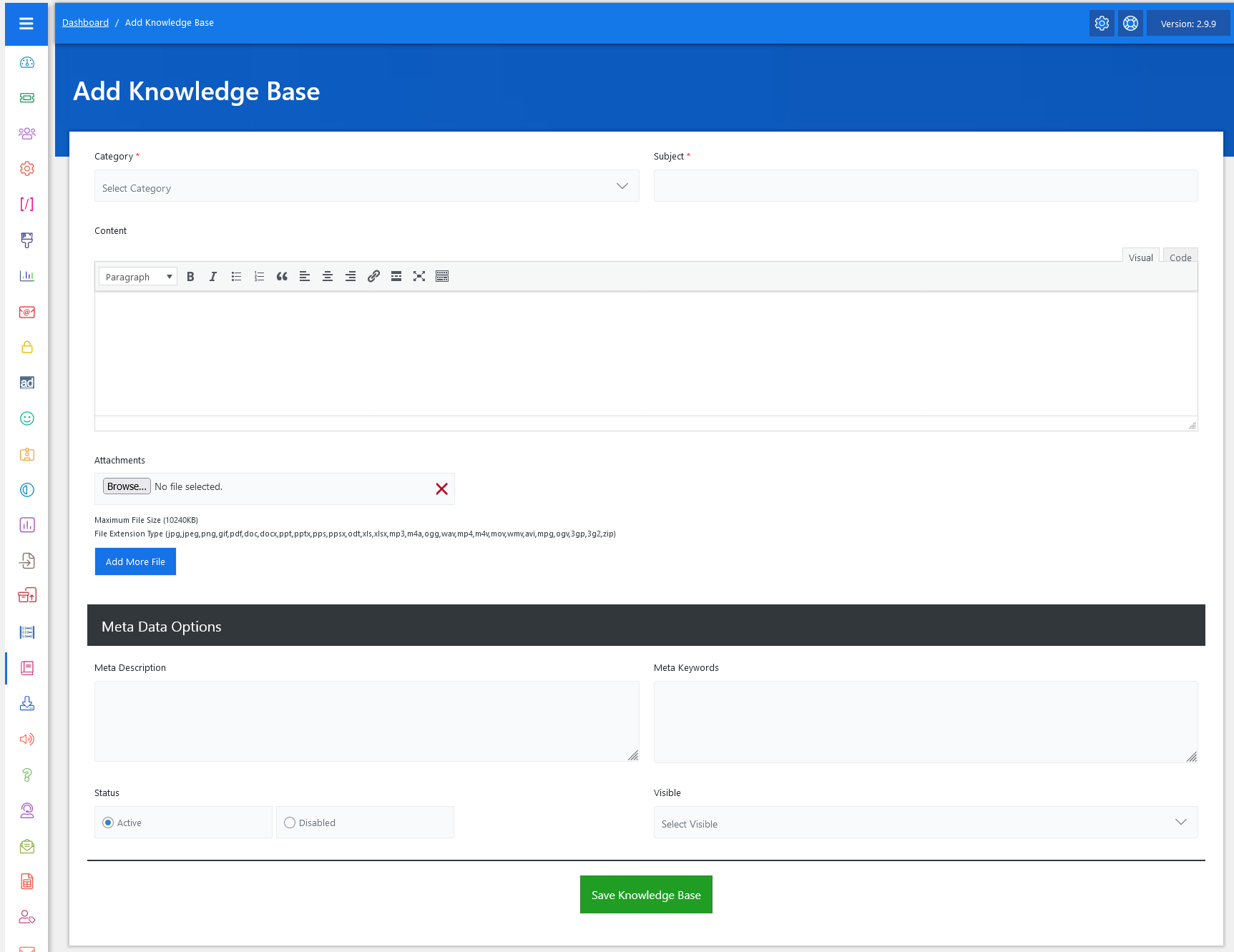 Adding a new knowledge base is simple. Just click the “Add Knowledge Base” button. You’ll be prompted to enter the Category, Subject, Detailed Content (via a rich-text editor), Attachments, Status, and Visible. This allows you to manage content in a structured way. For example, under a Technical Support category, you might add an article like “How to Reset Your Account Password,” complete with step-by-step instructions and screenshots.