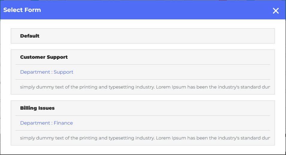 When you click the “Create Ticket” button, a pop-up will appear on the screen. You can select the form to create a ticket according to your requirements. The pop-up has multiple ticket forms that require a name, department, and description. For example, you might have one form for “Customer Support,” another for “Billing Issues,” and a third for “Product Feedback,” each form with its relevant fields.