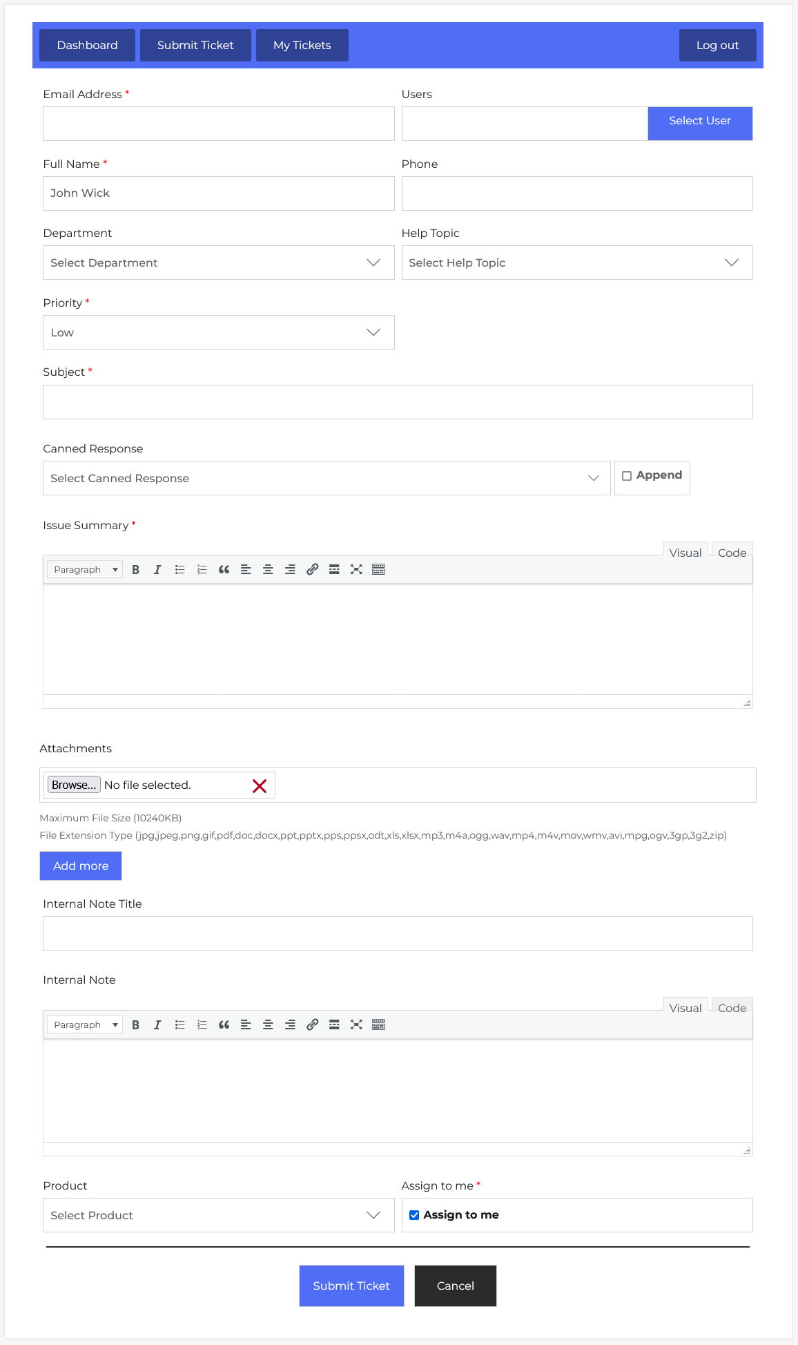- Assign to Me: Choose whether to assign the ticket to themselves using the checkbox. If unchecked, the ticket may remain unassigned.