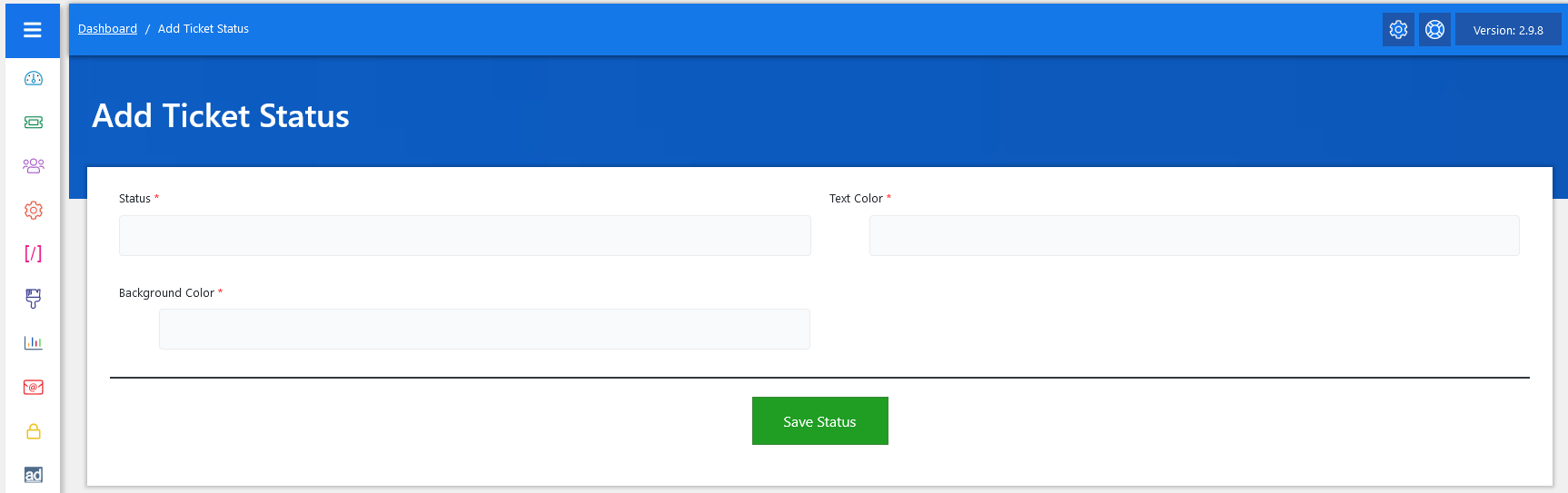 Now, let’s walk through the step-by-step process of adding a ticket status from the admin end. From your admin dashboard, navigate to the Admin Dashboard > Dashboard Menu > Add Ticket Status to start adding a ticket status effectively. On the ‘Add Ticket Status’ form, we will provide all the necessary details for adding a ticket status.