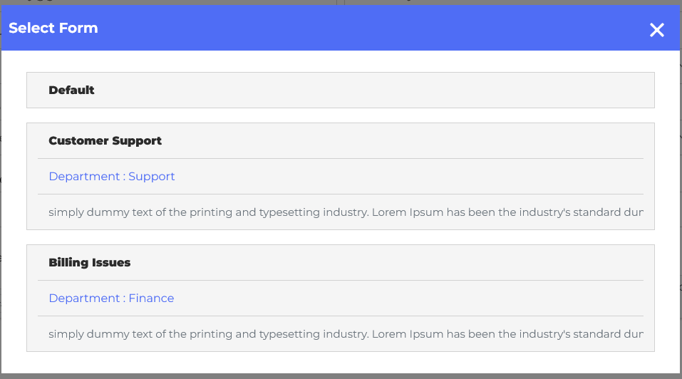 When you click the “Create Ticket” button, a pop-up will appear on the screen. You can select the form to create a ticket according to your requirements. The pop-up has multiple ticket forms that require a name, department, and description. For example, you might have one form for “Customer Support,” another for “Billing Issues,” and a third for “Product Feedback,” each form with its relevant fields.