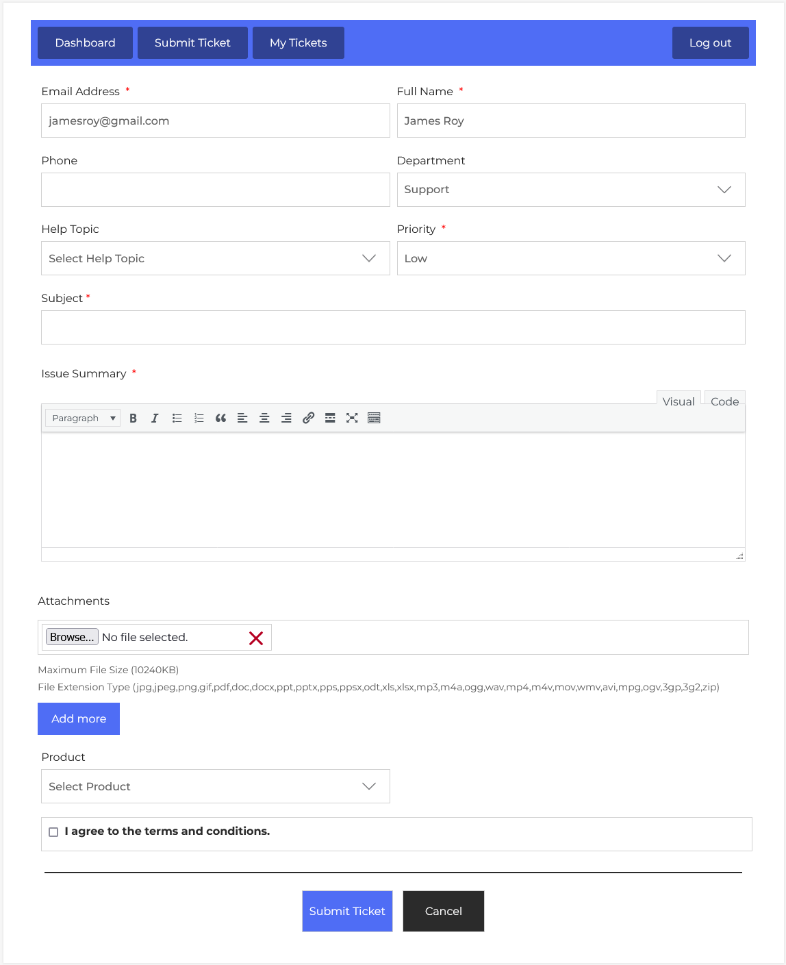 • Terms and Conditions: Before submitting the ticket, the user must check the box to agree to the terms and conditions. This ensures that the user consents to the support policies.