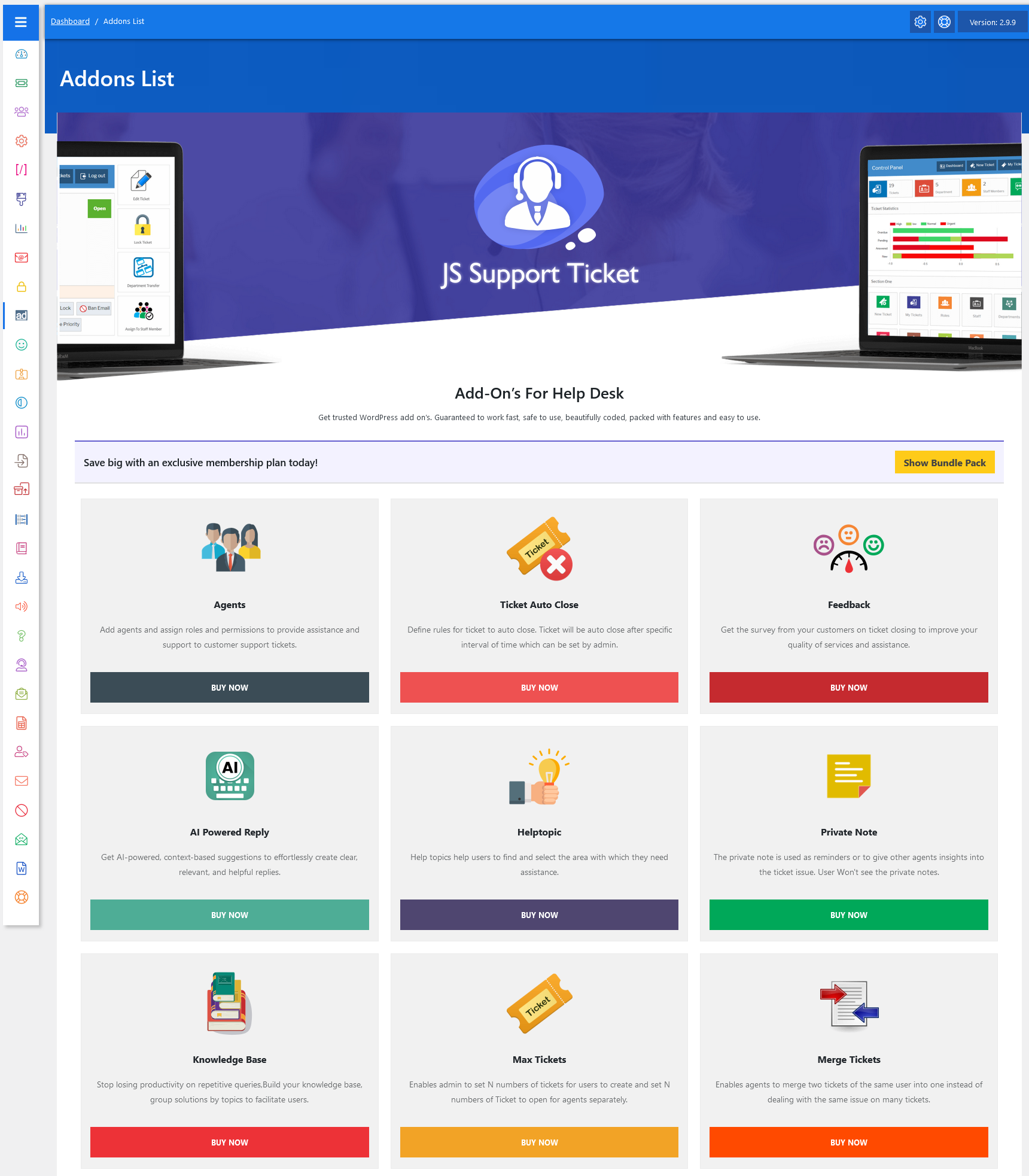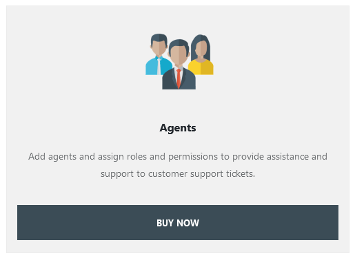 Each addon in the list is presented with its name, description, and a “Buy Now” option. This makes it easy for administrators to understand what each addon does before making a purchase decision. For example, the “Agents” addon allows you to add multiple agents and assign them roles and permissions so they can handle tickets efficiently. This is particularly useful for growing support teams that need different roles, like admins, supervisors, and regular support agents.