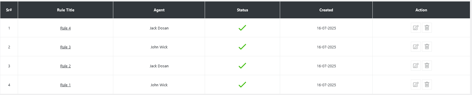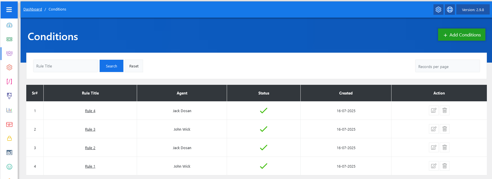 The conditions are managed under the “Conditions” section accessible from the admin dashboard. As shown in the image, this section displays a list of all active rules along with their assigned agent, current status (active/inactive), and the date the rule was created. You can easily take action using the edit or delete buttons under the Action column.
