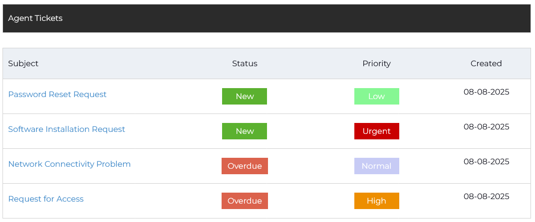 The Tickets table lists all tickets assigned to the agent within the chosen date range. Each row shows important details such as SubjectStatusPriority, and Created Date. This granular data is particularly useful for deeper performance analysis.