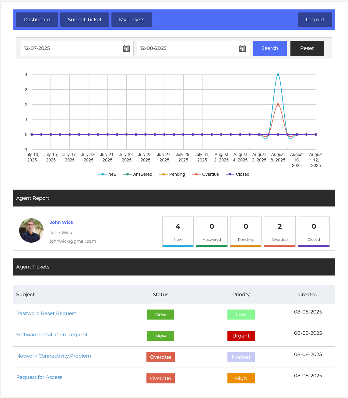 You can filter reports by selecting a date range. This helps in generating time-bound reports, such as checking an agent’s performance for the current week or comparing it to last month. The system will only display ticket activity for that agent within the specified dates.