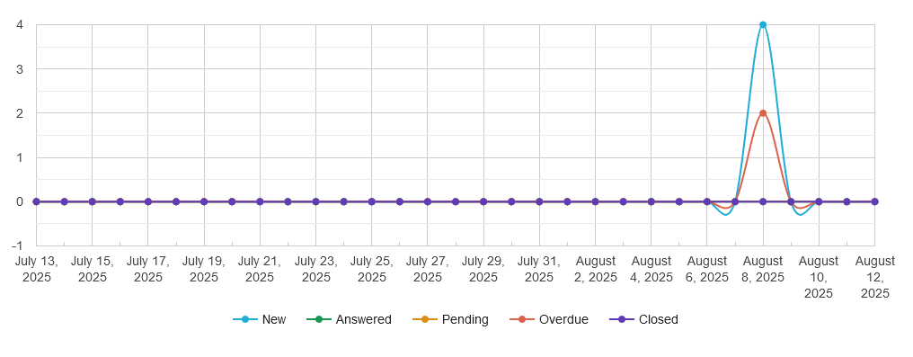 The Agent Statistics section includes a line chart that visualizes ticket trends over time. Each line represents a different status, like “New” in blue, “Answered” in orange, “Pending” in yellow, “Overdue” in red, and “Closed” in purple. By looking at the chart, you can easily identify activity spikes or drops.