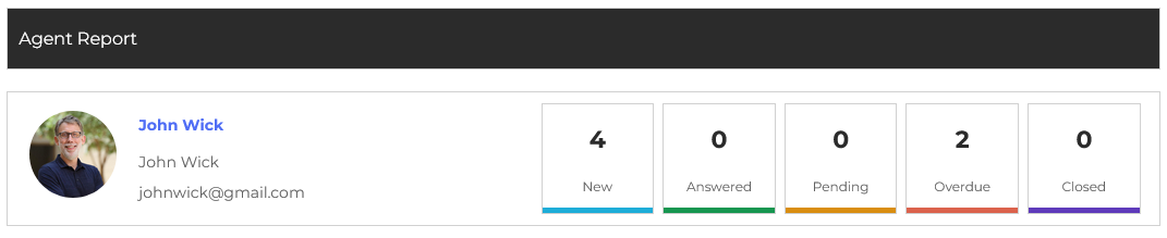 Beneath the graph, you will find the agent’s profile details, including their name, photo, and email address. This personalized display makes it easy to confirm which agent’s data you are reviewing. The status counters next to the profile—OpenAnsweredPendingOverdue, and Closed—show exact ticket counts. This gives a quick snapshot of the agent’s current workload. For example, if “Open” shows 4, it means the agent currently has four active tickets to handle.