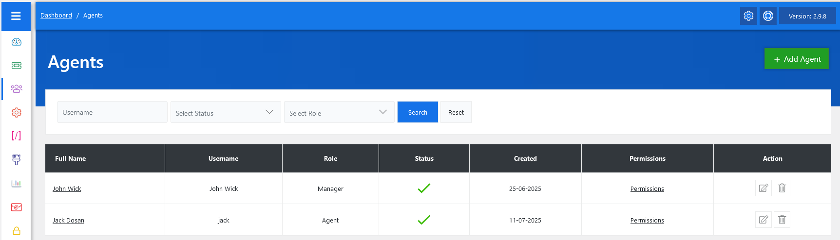 The Action column provides edit and delete icons. Clicking the pencil icon allows you to modify an agent’s profile, while the trash icon deletes the agent from the system.