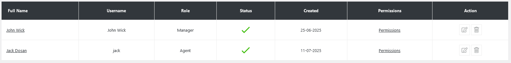 Each agent entry includes the following key fields: Full Name, Username, Role, Status, Created Date, Permissions, and Action. Each agent is assigned a Role, which defines their capabilities within the help desk. Common roles include Agent, Manager, or Admin, and each can be customized based on your workflow. For example, a Manager may have the ability to assign tickets and manage departments, while a regular Agent may only view and respond to tickets assigned to them.