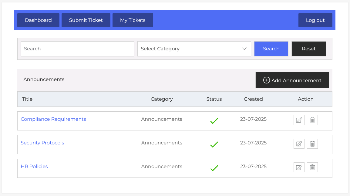 From the agent panel, announcements can be managed through a clean and intuitive interface. As seen in the screenshot, the interface lists all existing announcements in a tabular format with columns such as TitleCategoryStatusCreated Date, and Actions. This view gives the agent a quick overview of what messages are currently active, their publishing status, and options to edit or remove them.
