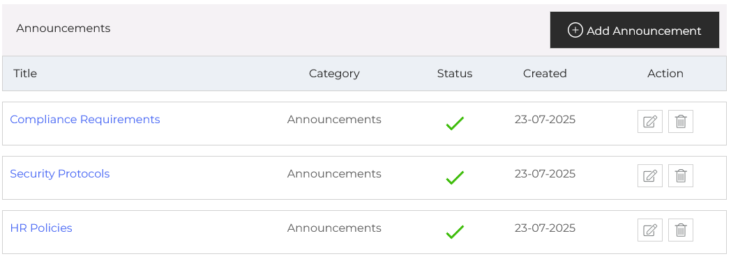 • Action: You can update or delete the announcement anytime using the action buttons on the right side.