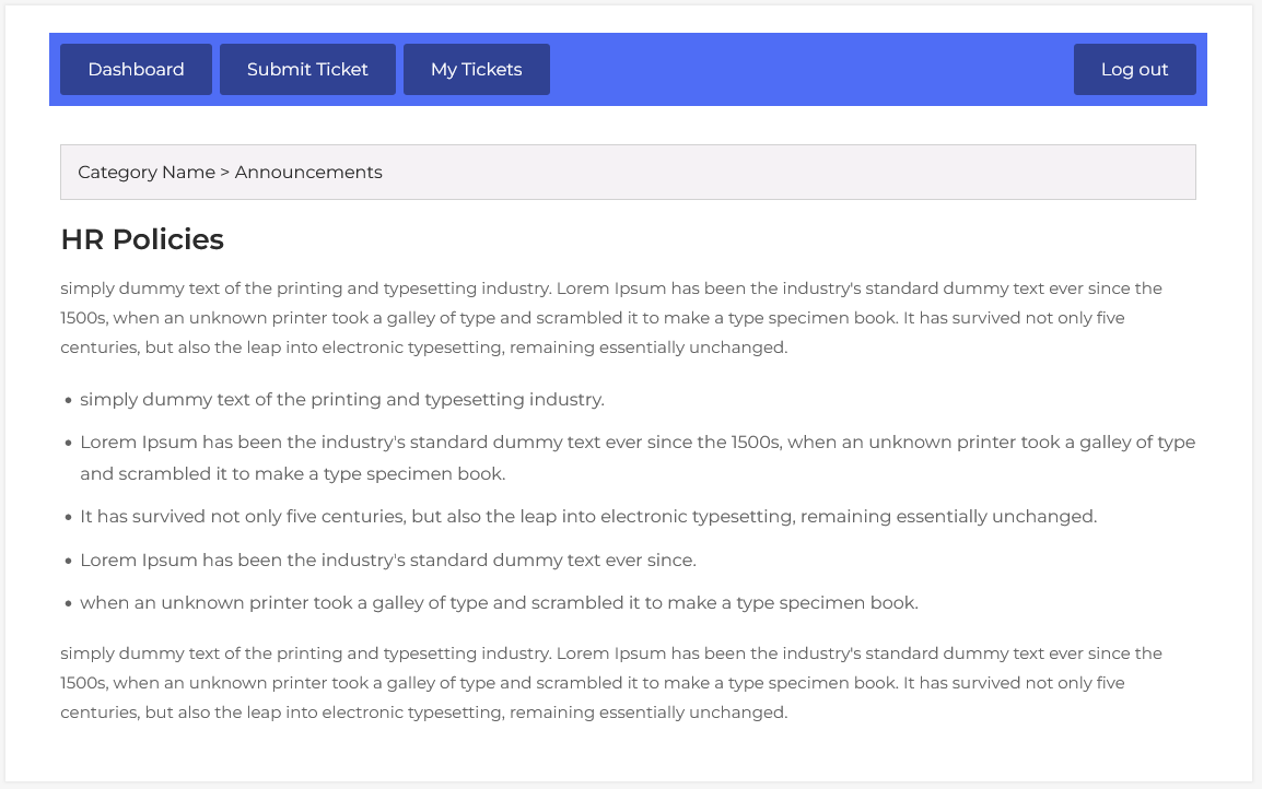 When a user clicks on the announcement title, they are redirected to the detailed view, where they can see the full content of the announcement. At the top, the category path (e.g., Category Name > Announcements) is displayed, helping users understand the structure and organization of the announcement.