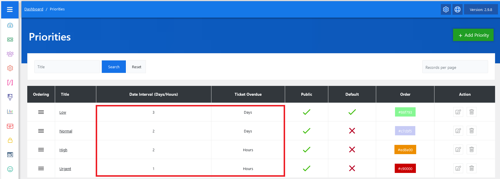 From your admin dashboard, navigate to the Admin Dashboard > Dashboard Menu > Priorities. On the priorities page, you will find various options for the admin to manage priorities. All details about auto-mark ticket overdue and how the admin manages them are discussed here.