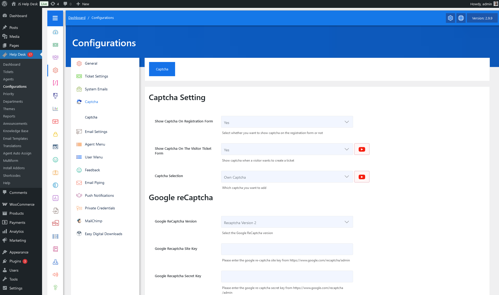 As an administrator, navigate to theĀ Admin Dashboard > Dashboard Menu > Configurations > Captcha. On the configurations page, you will find various configurations that the admin can use to manage the JS Help Desk. This page has all the captcha configurations on the JS Help Desk.