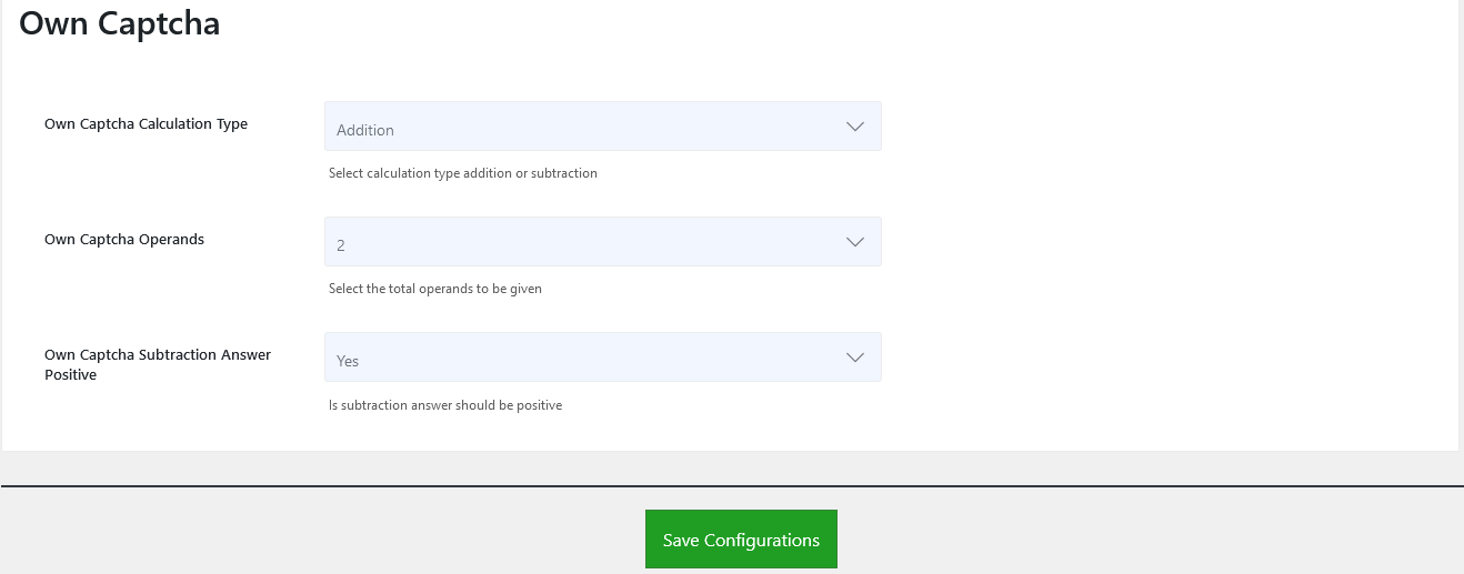 This configuration only affects if the captcha calculation type is selected for any captcha or subtraction captcha. This configuration determines whether the answer to the captcha must be positive or not.
