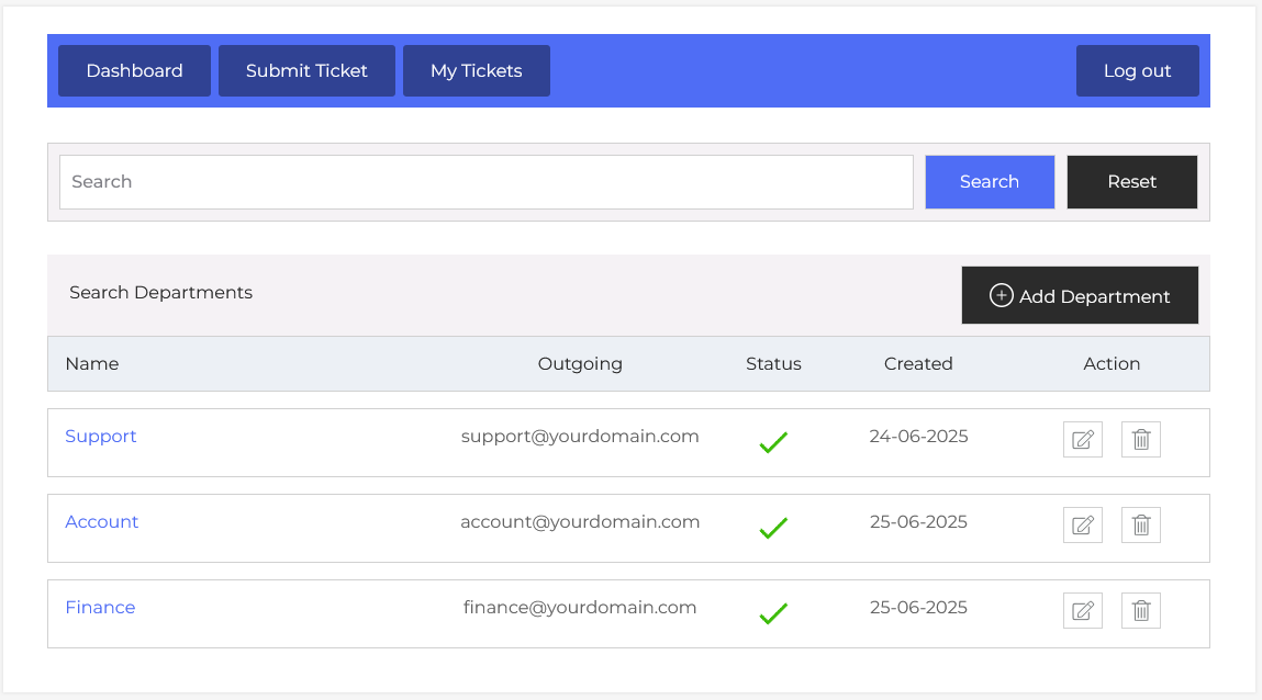 Each department in JS Help Desk can be assigned a unique Outgoing Email, allowing replies from agents in that department to be sent using department-specific email addresses. For example, tickets related to billing issues can be handled by the Finance department, and responses can be sent from “finance@yourdomain.com”, helping users recognize the source of communication and maintain trust.