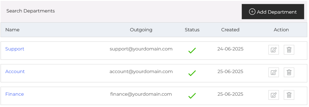 The Status column shows whether a department is active or inactive. An active department (indicated with a green check) is visible and usable across the system, whereas an inactive one is hidden from users and cannot receive new tickets. Additionally, there’s an option to “Add Department” at the top right of the “Departments” page.