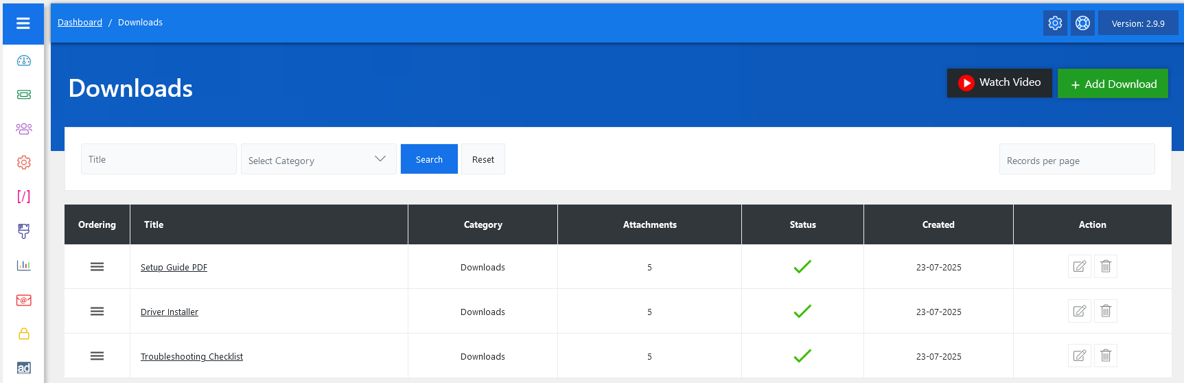 You can use the search filter to find the downloads quickly. You can search by Downloads Title or select a specific Category. Simply choose a category from the dropdown, and clicking on the Search button will display the downloads corresponding to that criterion. The Reset button clears the filters and restores the full list of downloads.