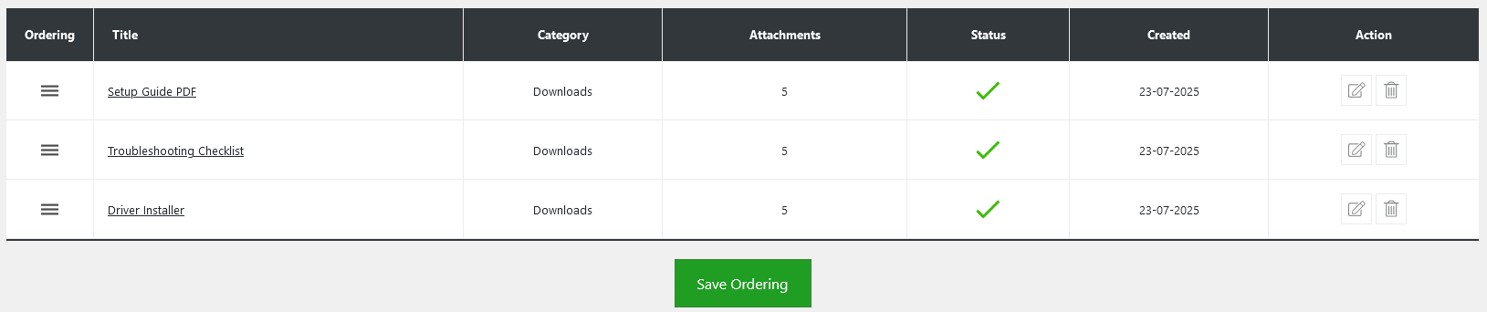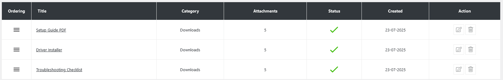 Admins also have control over the ordering of the articles using drag-and-drop functionality via the handle icon in the Ordering column. Additionally, there’s an option to “Add Downloads” at the top right of the “Downloads” page.