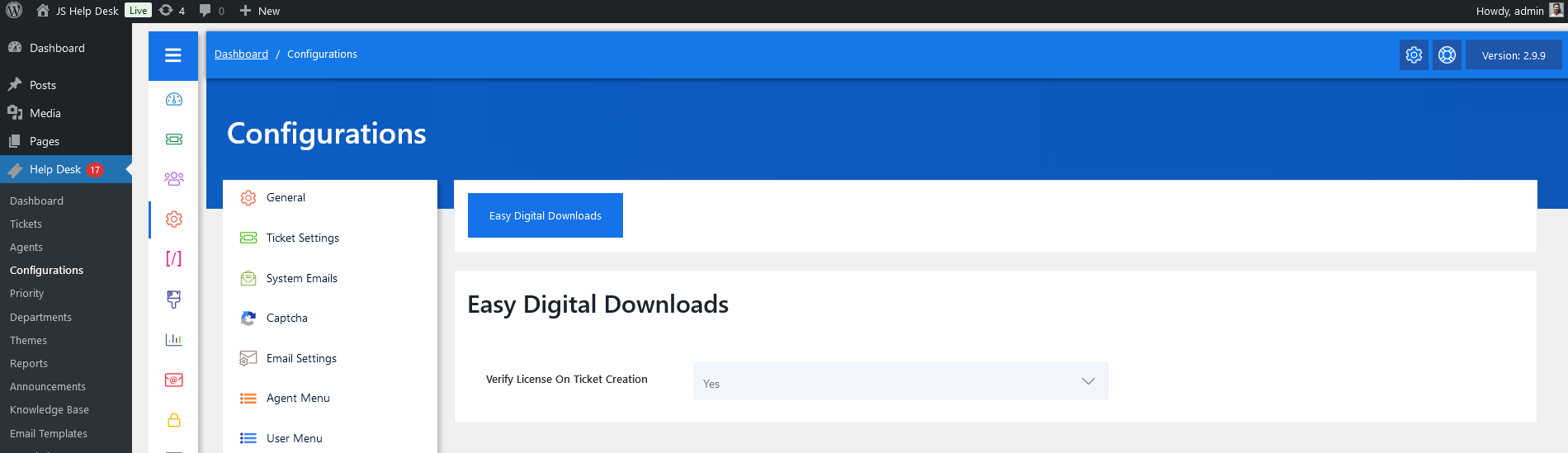 As an administrator, navigate to theĀ Admin Dashboard > Dashboard Menu > Configurations > Easy Digital Downloads. On the configurations page, you will find various configurations that the admin can use to manage the JS Help Desk.