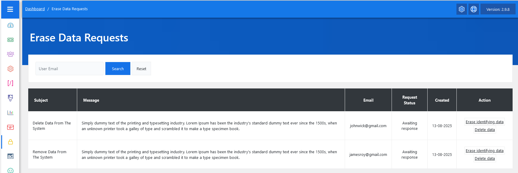 At the top of the interface, there is a search bar where you can enter a user’s email to filter the results. This makes it quick to locate specific requests, especially if your system handles multiple incoming requests daily. For example, if a user named James Roy has sent in a data erasure request, you can simply type jamesroy@gmail.com in the search bar to view only his request. The Reset button clears any filters and displays all pending and processed requests.