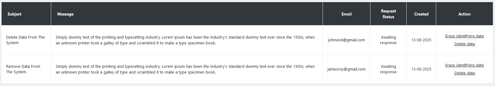 Each request is listed in a table format for easy review. The table includes the Subject of the request (e.g., “Delete Data From The System” or “Erase Data From The System”), a detailed Message from the user explaining their request, their Email, the current Request Status, the date it was Created, and an Action column for administrators.