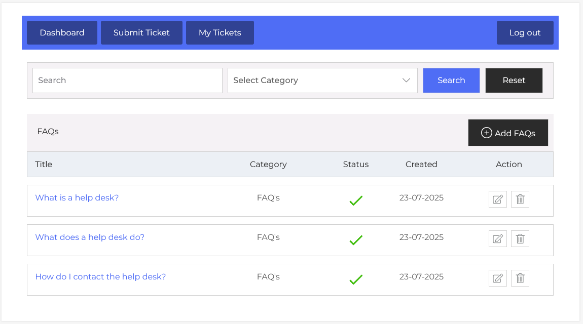 Here, agents can view existing faq’s and organize them by categories. Each faq has metadata like a title, category, status, created date, and action buttons for editing or deleting. For example, you might have faq’s titled “What is a help desk?” “What does a help desk do?” and “How do I contact the help desk?” each help users solve specific problems without opening a support ticket.