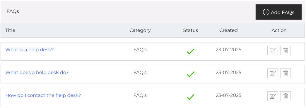 - Action: You can update or delete the faq anytime using the action buttons on the right side.
