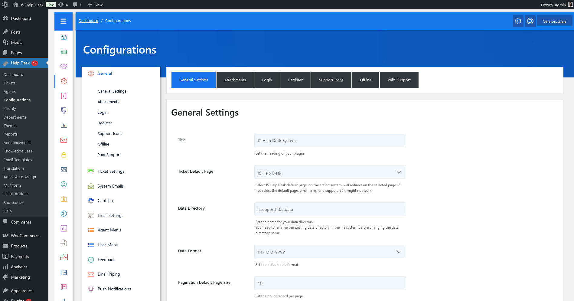 As an administrator, navigate to the Admin Dashboard > Dashboard Menu > Configurations > General Settings. On the configurations page, you will find various configurations that the admin can use to manage the JS Help Desk. This page has all the general configurations on the JS Help Desk. Anything that affects both the user side and the agent side is listed here.