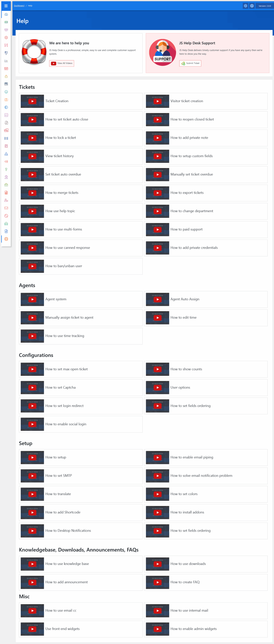 From your admin dashboard, navigate to the Admin Dashboard > Dashboard Menu > Help. On the help page, you will find all the details about JS Help Desk.
