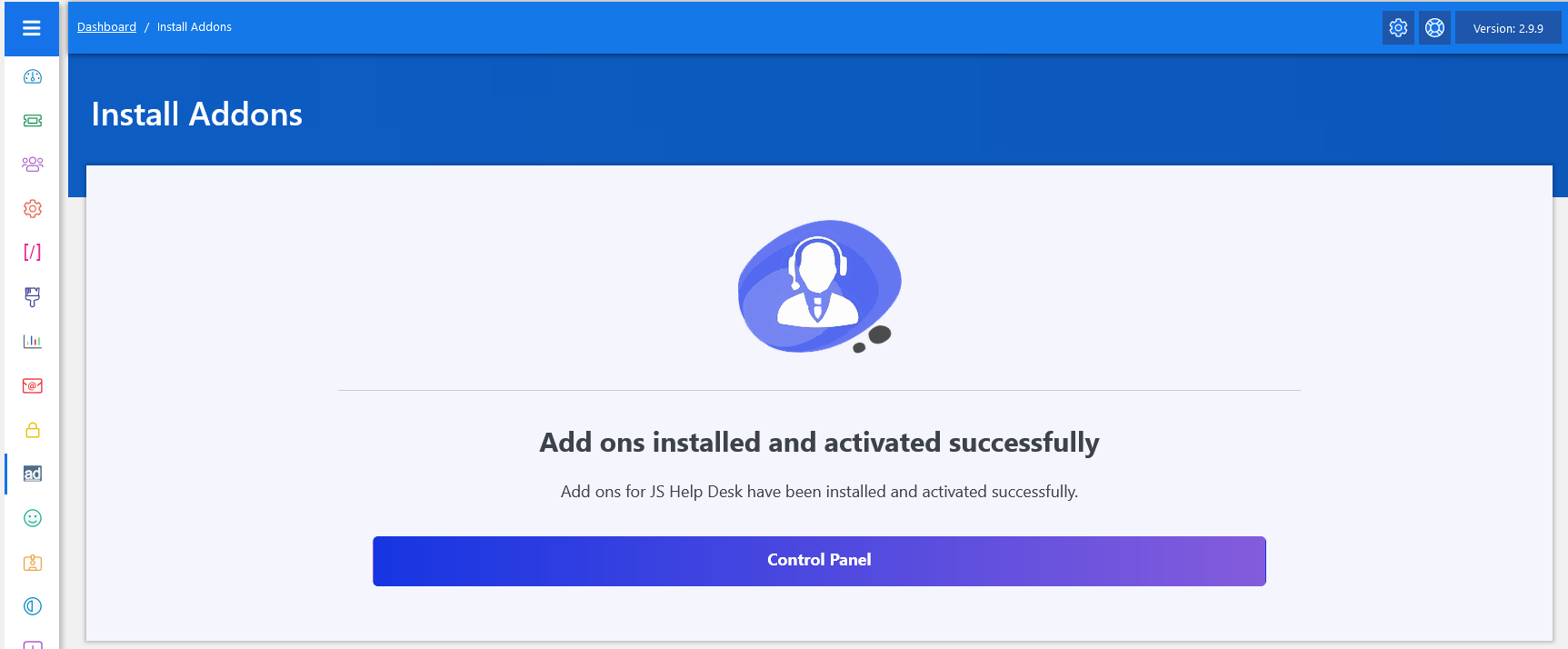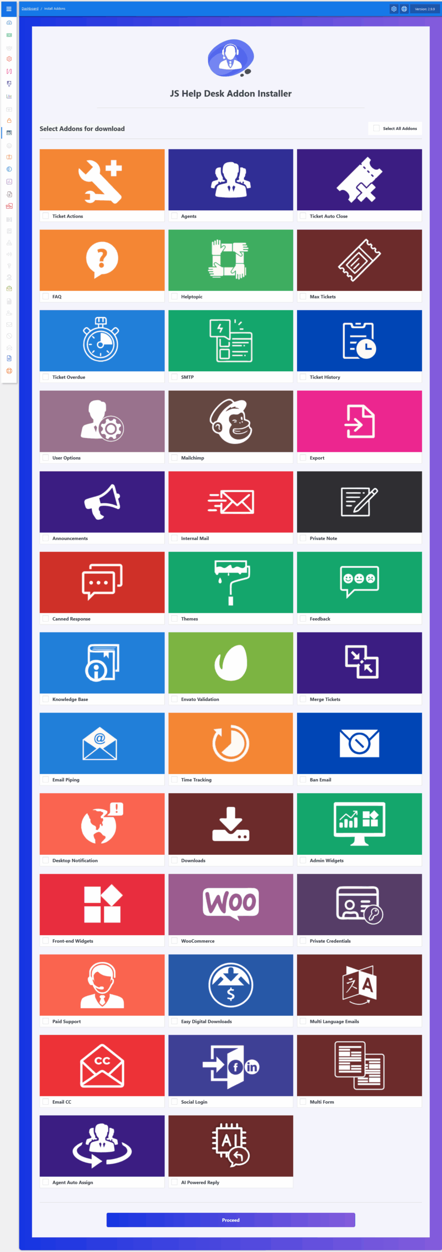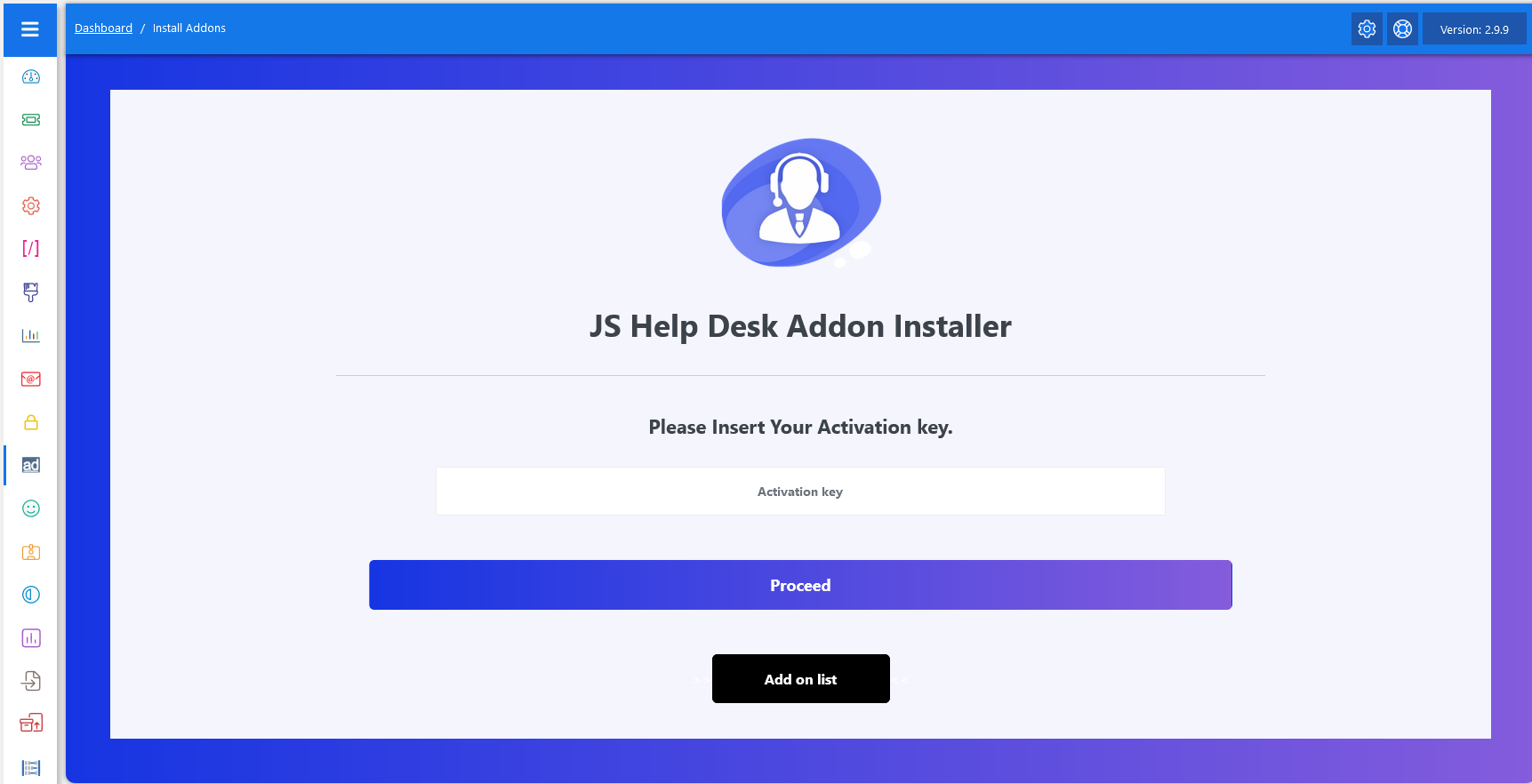 For the add-on installation, locate the “Install Add-on” button in the menu and click on it. This will bring you to the user-friendly add-ons installer screen of the JS Help Desk. Enter the key in the designated field and click the “Proceed” button. This will enable you to install the add-ons based on your package. On the add-ons installation screen, you can select the specific add-ons you want to install, depending on your package.