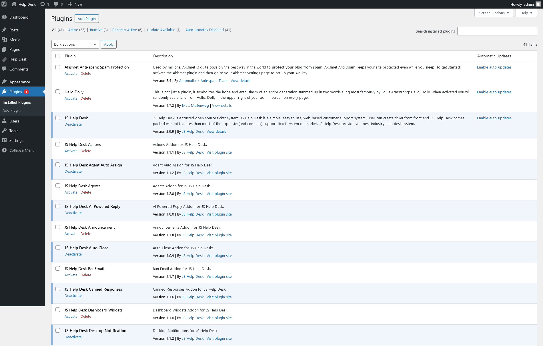 Open up the admin dashboard of the JS Help Desk. From the dashboard, you may notice that some of the feature links in the menu are inactive and inaccessible. To make them accessible, you’ll need to install the add-ons corresponding to these features.