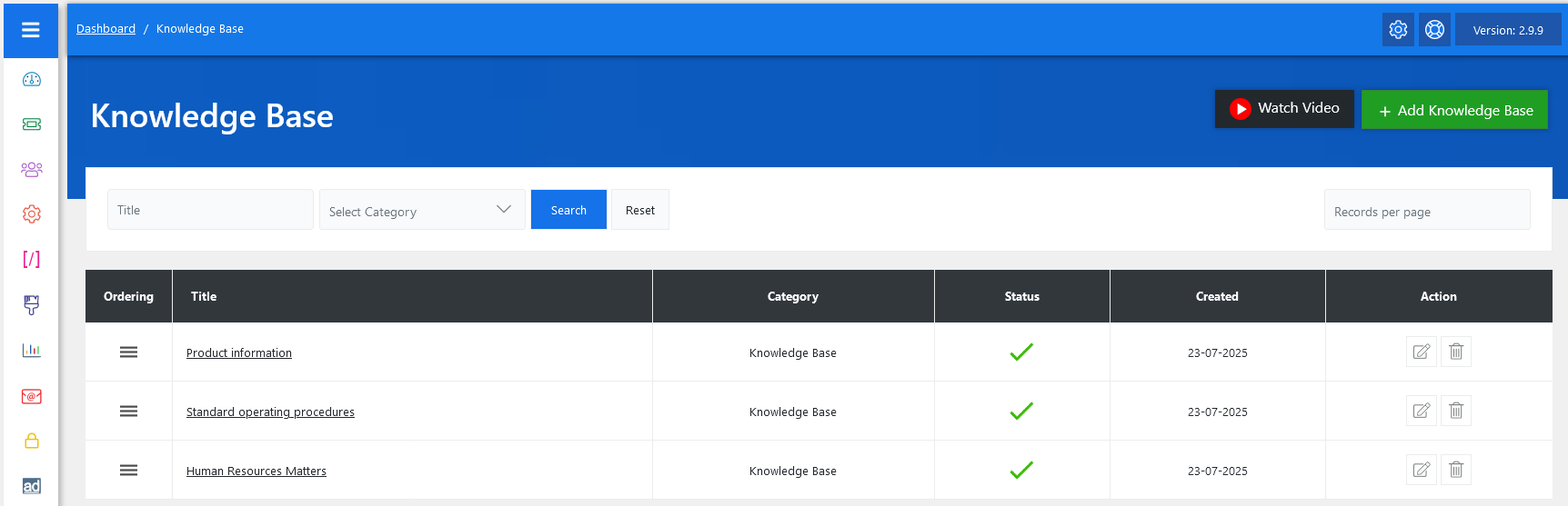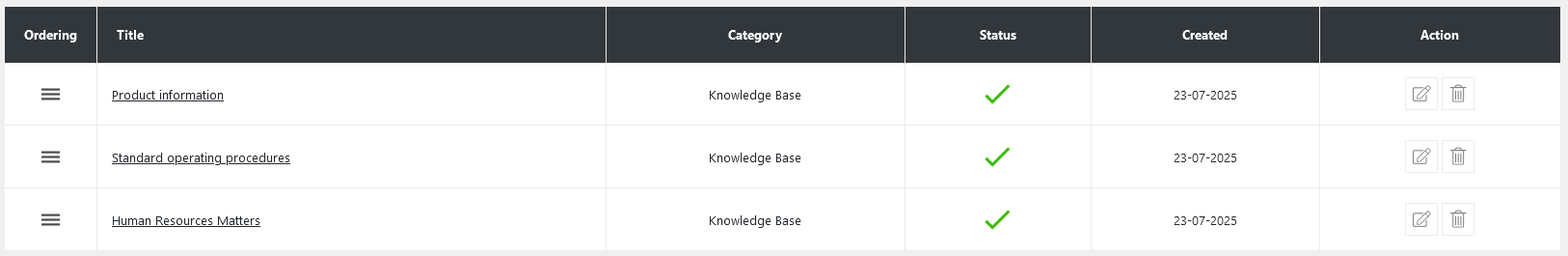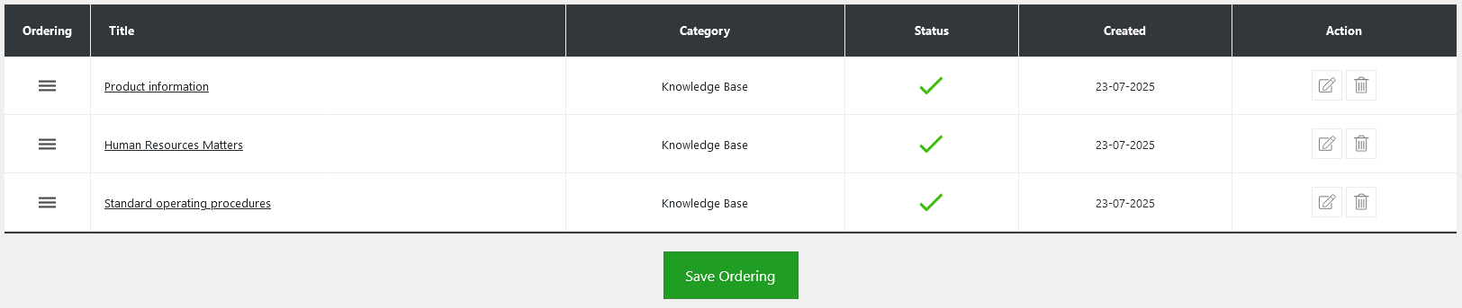 Admins also have control over the ordering of the knowledge base using drag-and-drop functionality via the handle icon in the Ordering column. Additionally, there’s an option to “Add Knowledge Base” at the top right of the “Knowledge Base” page.
