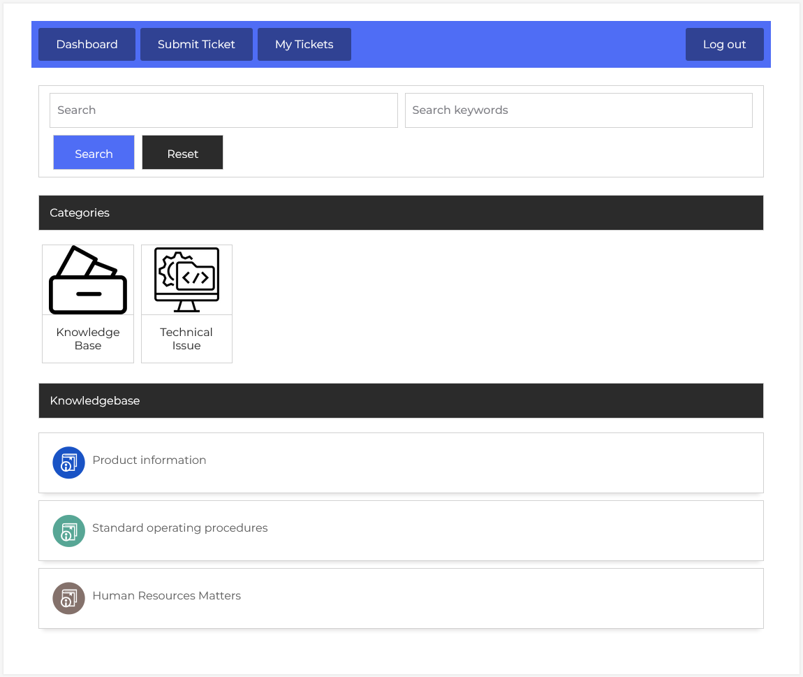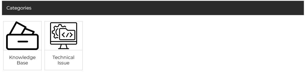 The system displays Categories with clear icons such as “Knowledge Base” and “Technical Issue.” These serve as entry points for browsing articles grouped by topics. Categories help users narrow down the type of support content they need, whether it’s general information, troubleshooting guides, or technical documentation.