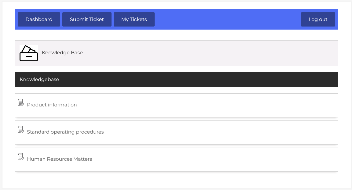 Clicking on any of these categories will expand the section. As shown in the interface, the knowledge base is structured with clear categorization. At the top, a labeled section titled “Knowledge Base”. Within this category, knowledge base articles are shown below in an image. The user can view the article’s detail page by clicking on the knowledge base title.