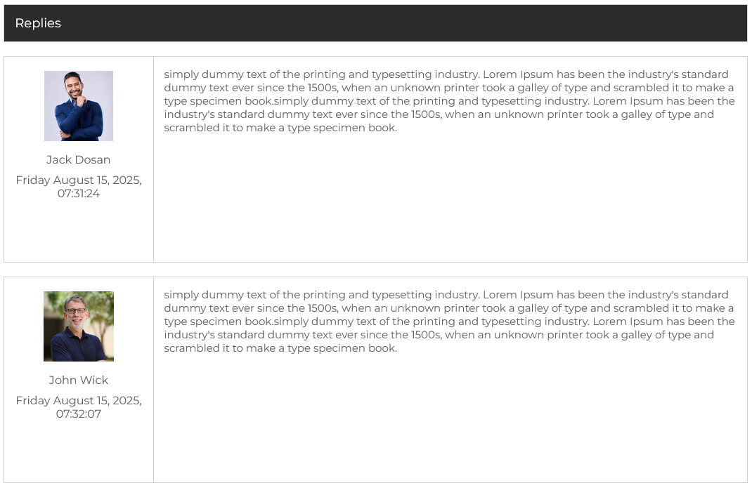 Below the main message, the Replies section shows all responses in chronological order, including the responder’s name, profile image, date, and time. This threaded view allows you to follow the conversation without jumping between screens. For instance, if Jack Dosan replies at 07:31:24 and John Wick follows up at 07:32:07, you can easily see the back-and-forth exchange.