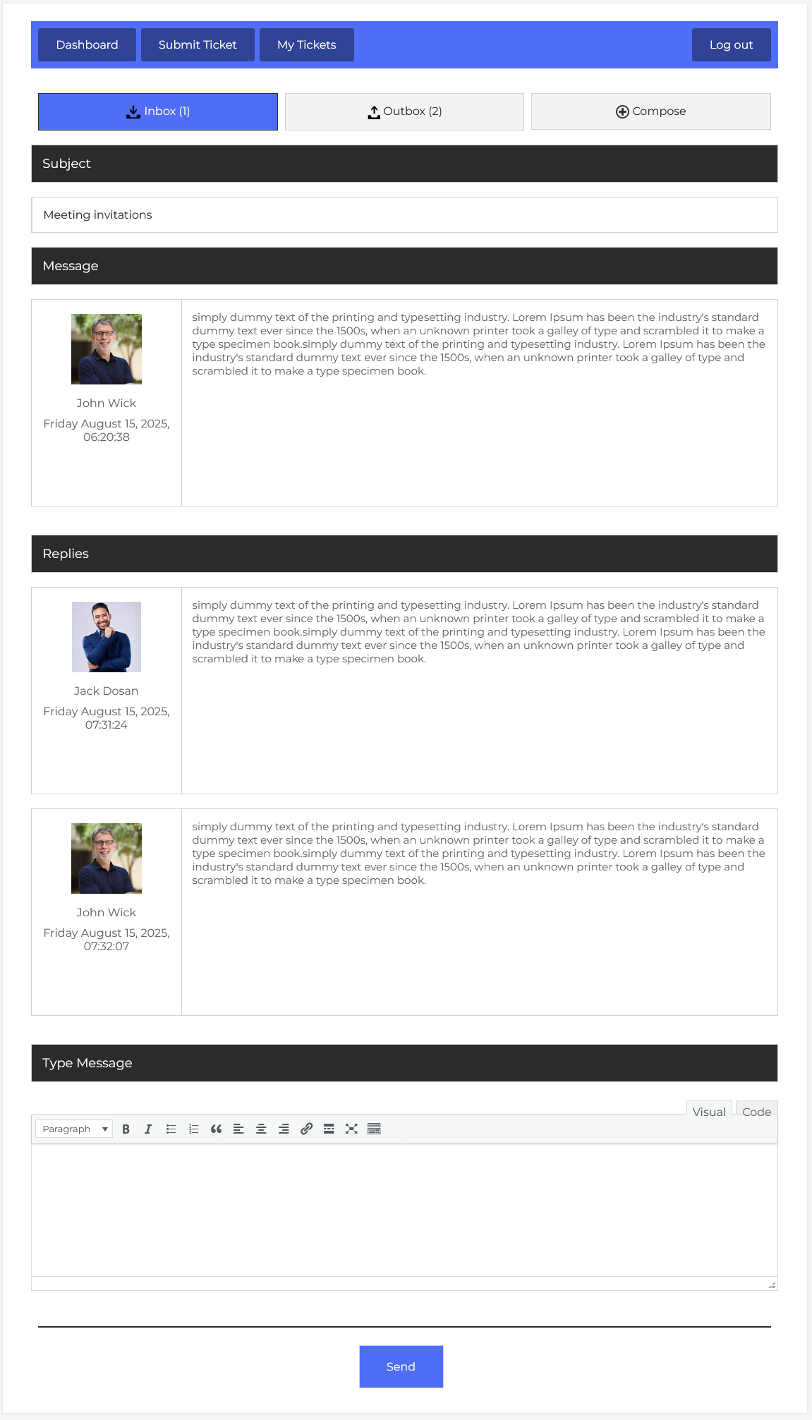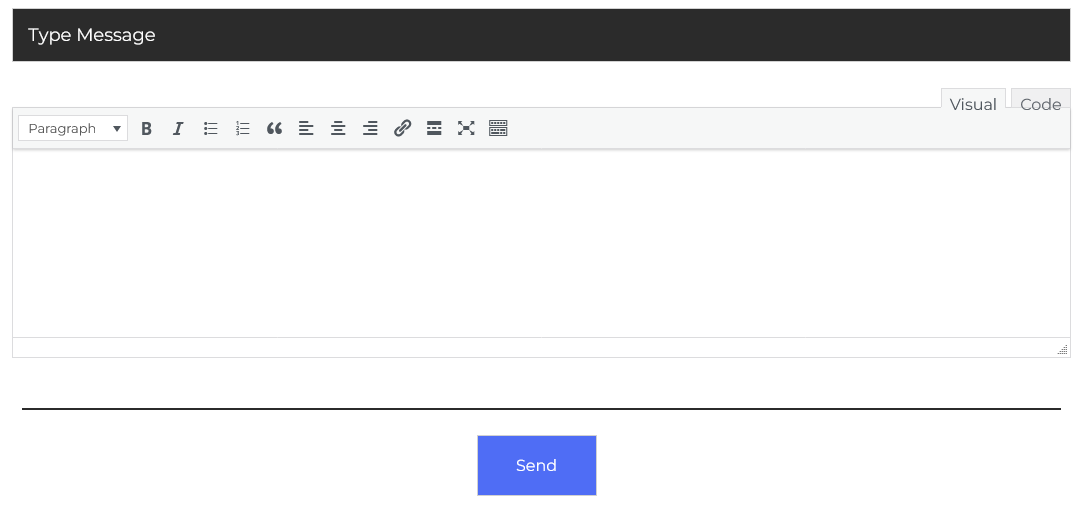 At the bottom, the Type Message editor lets you compose your reply directly within the conversation. You can use text formatting tools like bold, italics, lists, links, and more, making your replies clear and professional. There’s also a Visual and Code mode for those who prefer HTML formatting, giving you flexibility in message styling.