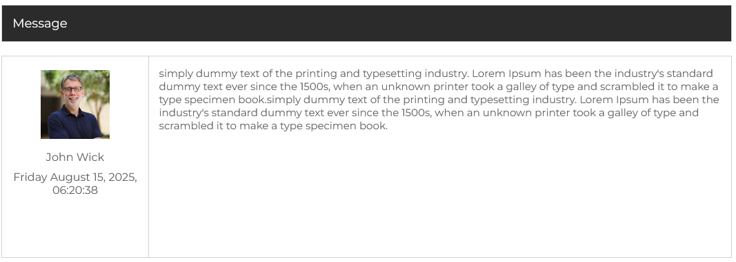 The Message section contains the original message details, including the sender’s profile picture, name, date, and time of sending. The content is displayed in a text box for easy reading. This setup ensures that you can identify who sent the message and when, which is crucial for maintaining an organized communication flow.