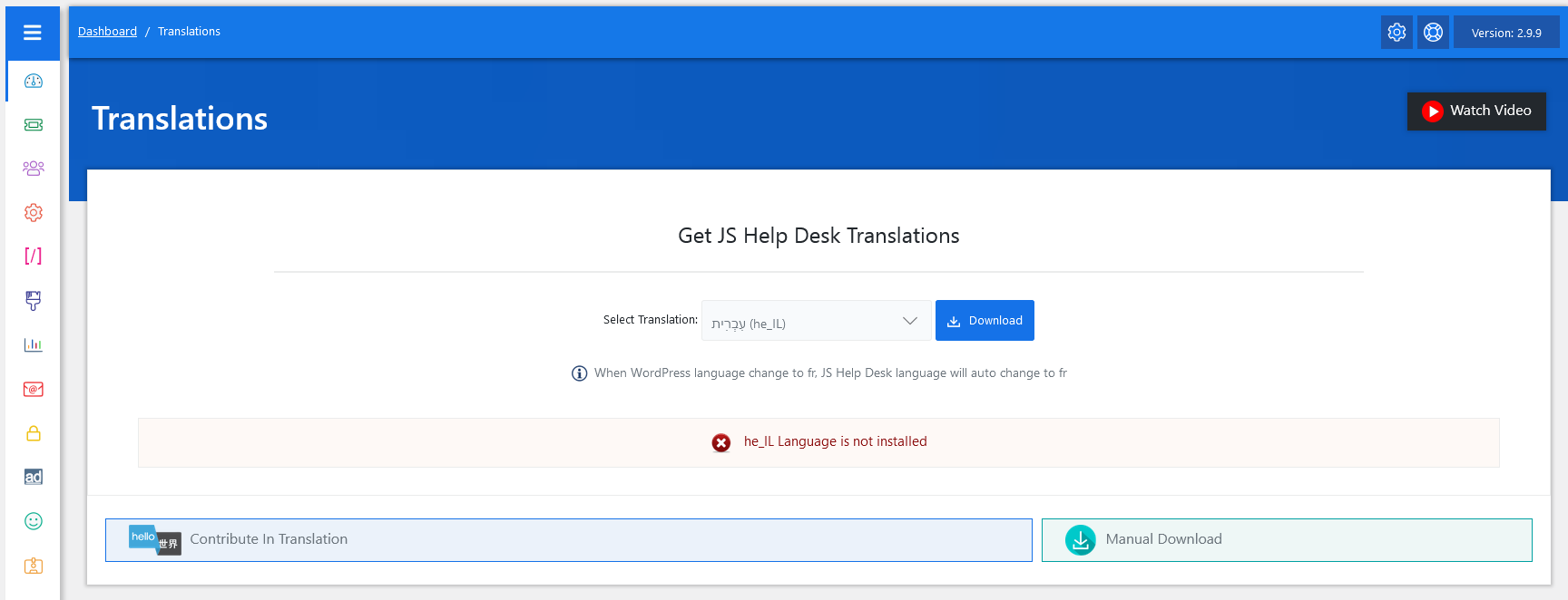From your admin dashboard, navigate to Admin Dashboard > Dashboard Menu > Translations. This will take you to the translation page. The Translation feature in JS Help Desk allows you to run your help desk in multiple languages. This is especially important if your support system is used by a global audience. Instead of only showing text in English, you can translate all labels, buttons, and system messages into any language (e.g., Arabic, Spanish, French, etc.). Select your desired language from the drop-down list that you want to install. When you select a language, you see this message: “Language Not Installed”.