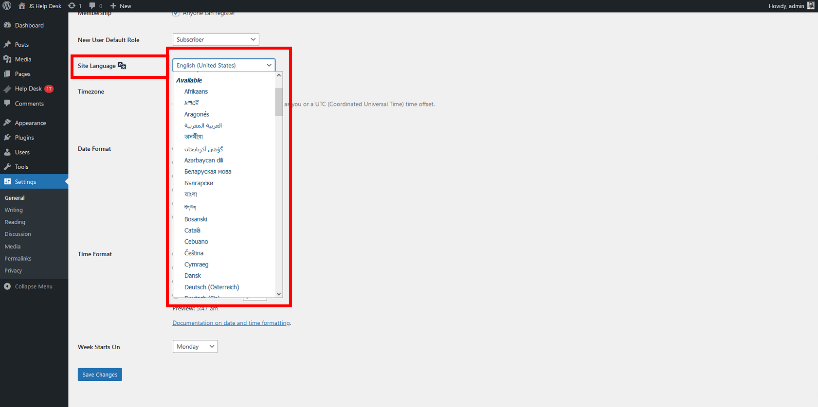 From your admin dashboard, navigate to Admin Dashboard > WordPress Menu > Settings. Select your desired language from the drop-down list and click on the Save Changes button.