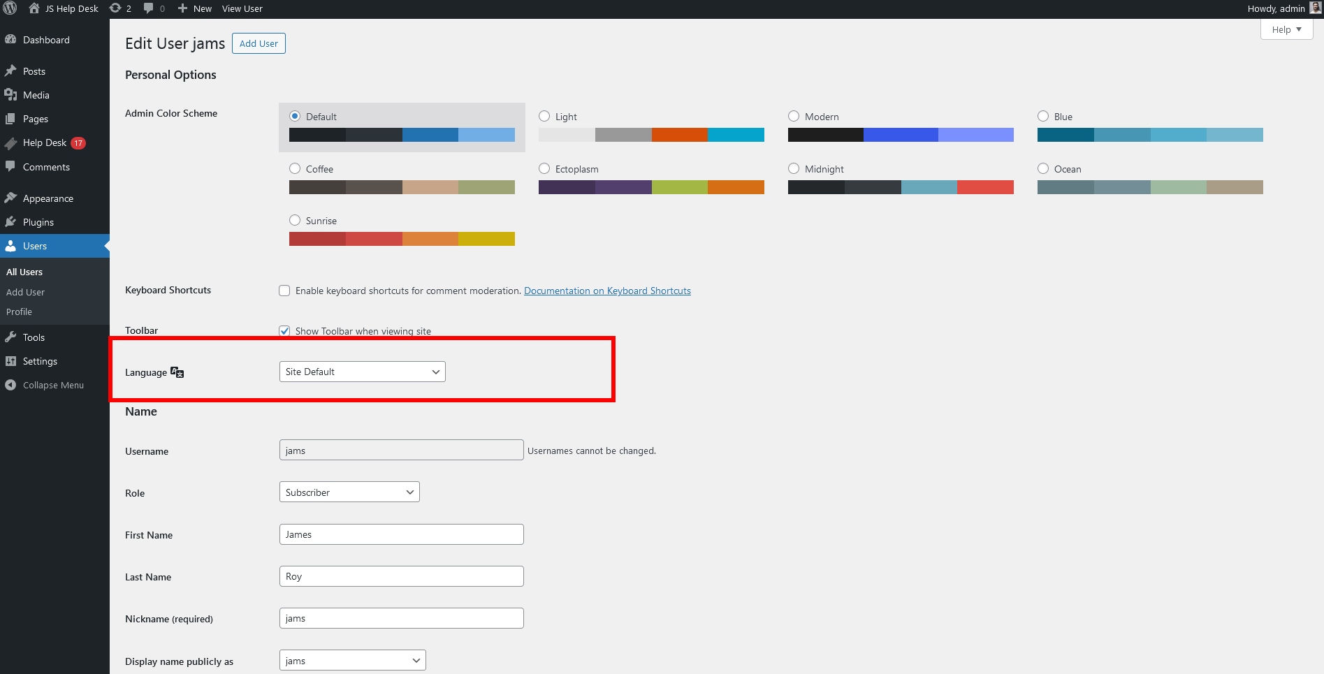 From your admin dashboard, navigate to Admin Dashboard > WordPress Menu > Users. This will take you to the user’s page and open the user in edit mode. Select your desired language from the drop-down list and click on the update user button.