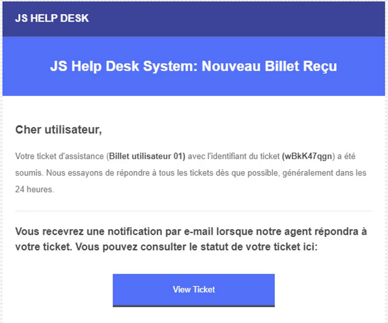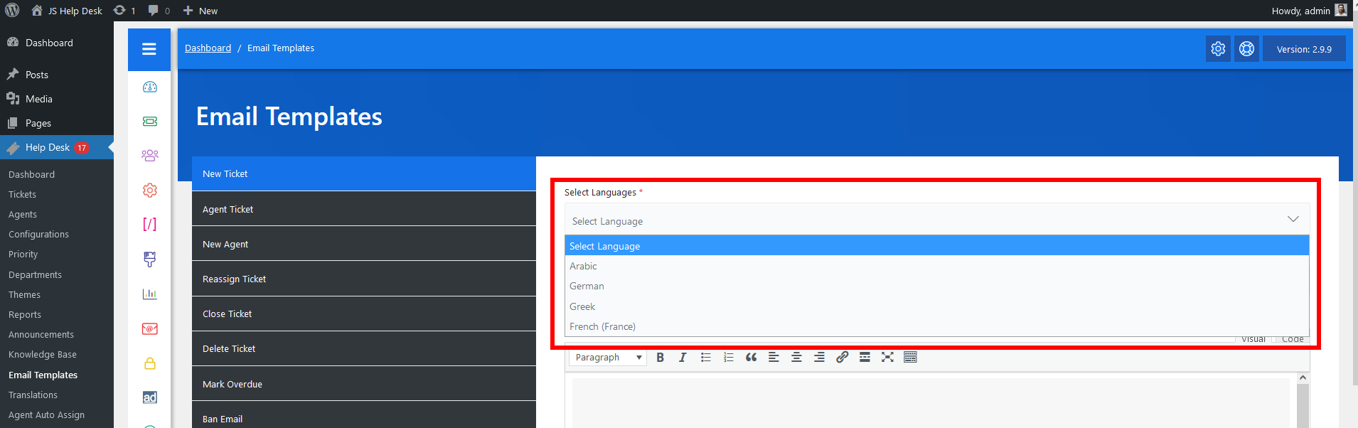 Another powerful aspect is the multi-language support. You can select a language from the drop-down list and create localized templates for users in different regions. For example, you might prepare one version of the “New Ticket” template in English and another in Spanish. When a Spanish-speaking user submits a ticket, they will automatically receive the notification in their preferred language. This helps build trust and improve communication across diverse user bases. Select a language from the drop-down list and click on the Save Email Template button.