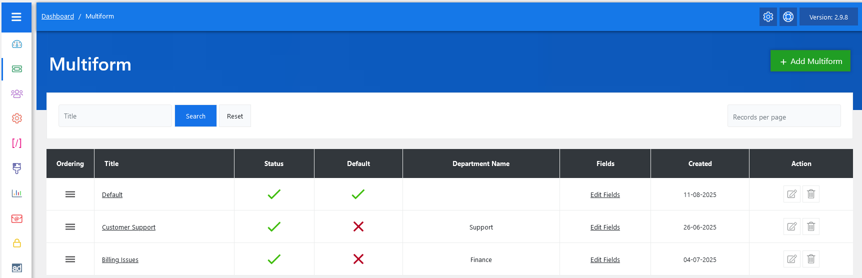 Display the list of how many multiforms are added. Admin also views the multiform title, status, default, Department name, fields, created, and action of the multiforms. Admin can also edit and delete the multiforms.