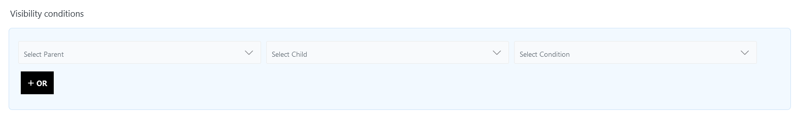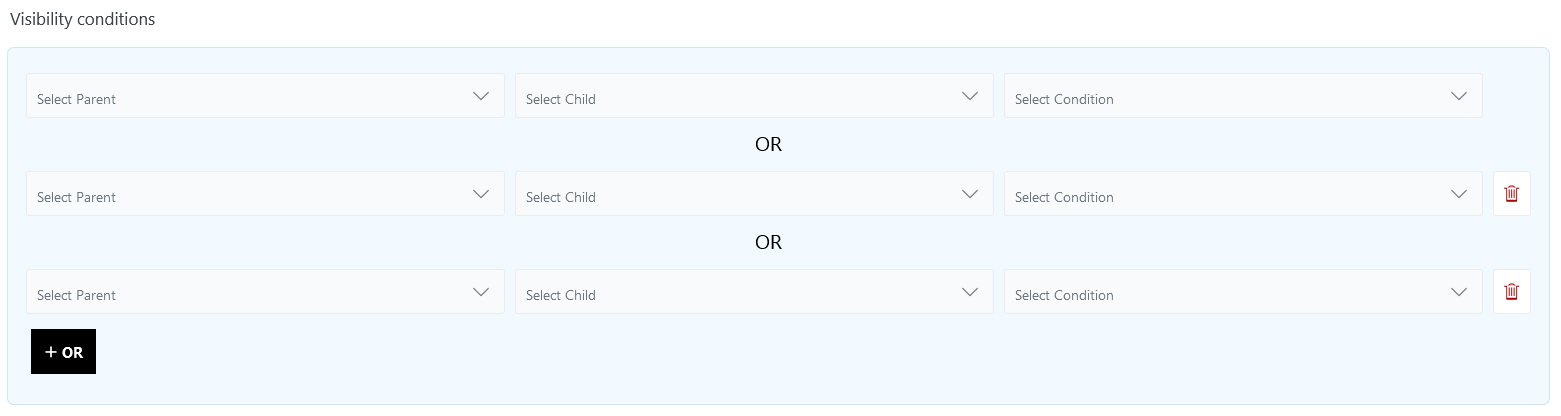 You can easily add more OR rules using the “+ OR” button. Each added rule increases the chances of the field being shown, as only one needs to match. You can also delete individual OR conditions using the trash icon.