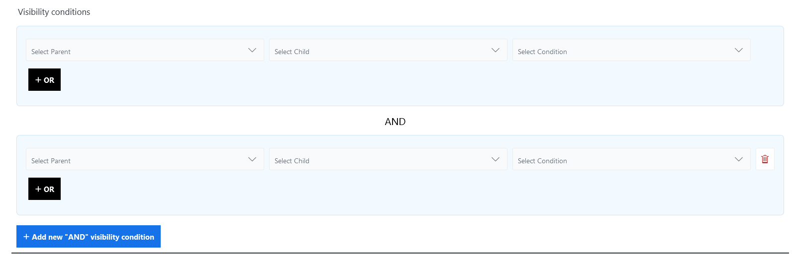 You can add a new AND group using the “+ Add new ‘AND’ visibility condition” button. Each group is evaluated as a separate condition set that must be satisfied for the field to be shown. This gives you fine-grained control over when each field appears on the form.