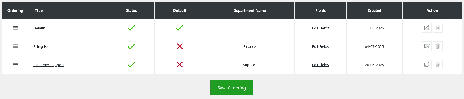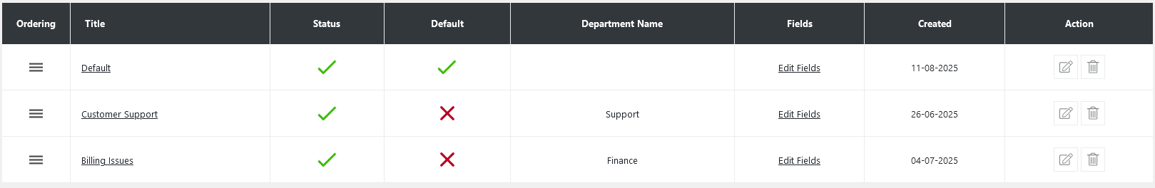 - Actions: Admin can edit and delete the ticket form by using these action buttons.